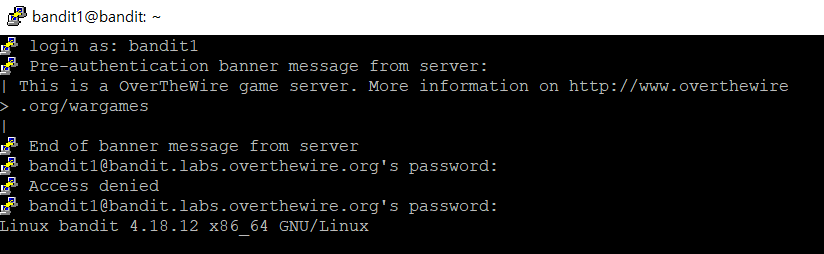 The password for the next level is stored in a file called readme located in the home directory. Use this password to log into bandit1 using SSH. Whenever you find a password for a level, use SSH (on port 2220) to log into that level and continue the game.