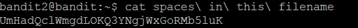 The password for the next level is stored in a file called spaces in this filename located in the home directory