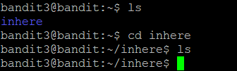 계속 그랬듯이 이번엔 bandit3으로 로그인 한 상태에서 ls를 입력했다. 입력하면 나오는 inhere디렉터리에 들어가서 다시 ls를 입력했더니 파일이 숨김상태여서 아무것도 뜨지 않는다.