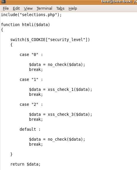 해결방법을 찾기 위해 /var/www/bWAPP/ 에 있는 htmli_get.php 코드를 살펴본다