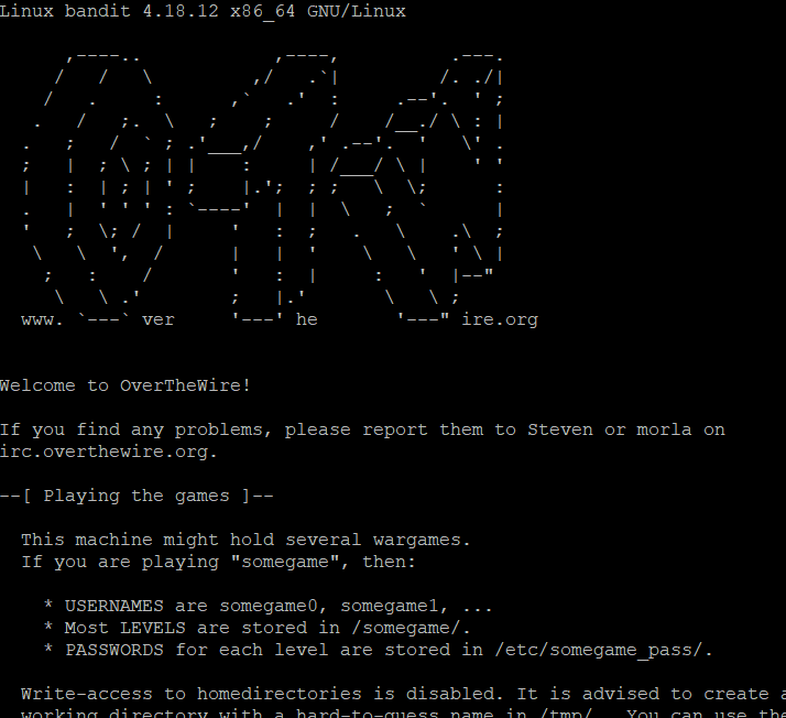 The goal of this level is for you to log into the game using SSH. The host to which you need to connect is bandit.labs.overthewire.org, on port 2220. The username is bandit0 and the password is bandit0. Once logged in, go to the Level 1 page to find out how to beat Level 1.
