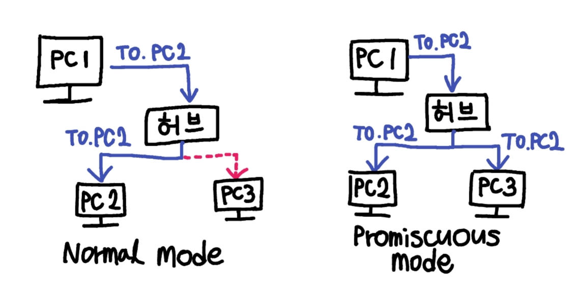pc3이 자신이 받아야 할 데이터는 아니지만 의도적으로 수신함