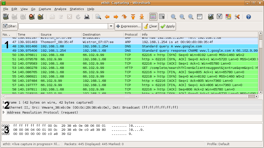 3: 실제 주고받은 내용을 16진수로 보여줌